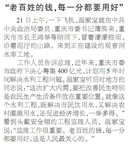 工作人员告诉总理,近年来,重庆市委市政府下决心筹集400亿元,计划用5年时间解决水利工程问题。这次扩大内需,为解决水利工程的欠账提供了机遇。温家宝听后对地方的同志说:“这次扩大内需,要把改善民生特别是农民生产生活条件放在重要位置。就像这个水利工程,既解决市民饮用水,又解决农村灌溉用水,还促进经济增长,一举多得。”看到头戴安全帽的工程监理人员,温家宝说:“监理工作很重要。老百姓的钱,每一分都要用好,这是人民最关心的。”