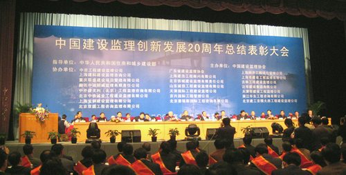 2008年12月12日,中国建设监理创新发展二十周年总结表彰大会在北京隆重召开,来自全国各地的代表聚集一堂,回顾历史、总结今天、展望未来。全国政协副主席白立忱,全国人大十届常委、环资委主任毛如柏,国务院南水北调办公室主任张基尧,住房和城乡建设部副部长陈大卫,标准定额司副司长田国民等领导应邀出席。会议由中国建设监理协会会长张青林同志主持。我省代表团一行25人参加了表彰大会。会上,陈大卫副部长传达了温家宝总理在《全国百家工程监理企业致温总理的一封信》上所作的重要批示,并作了重要讲话。